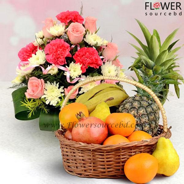 Gift a basket of seasonal fruits paired with a beautiful arrangement of pink and white flowers — a thoughtful and refreshing gesture for any occasion. This Package will go with:
