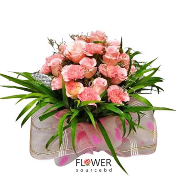 14 pieces imported pink carnations and 14 pieces imported pink roses with 1 stick of imported Limonium in a bouquet. You can send this amazing bouquet to your loved ones on their birthday, anniversary, and special occasions. Bring more joy to your loved ones on their special occasions by gifting this pink carnation and rose bouquet.