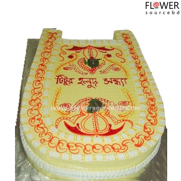 Cake for Gaye Holud. Price is shown for 3kg (6 pound - minimum weight for this cake) KULA shape Vanilla cake with special art and design from 'well food. This cake is also available in bigger size and different flavor - Chocolate, Blackforest and Mix-Flavor (layer of chocolate and layer of vanilla). Please select the required weight and preferred flavor, then Add this product to the Shopping Basket.