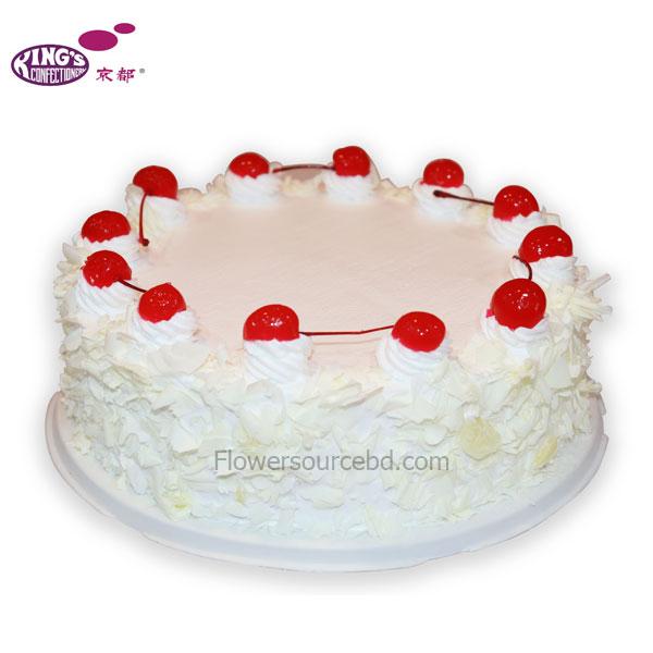 Indulge in the soft, creamy delight of this White Forest Cake from Kings! Layers of light vanilla sponge are generously filled with whipped cream and white chocolate flakes, topped with cherries for the perfect finishing touch. A refreshing twist on a classic, ideal for birthdays, anniversaries, or just a sweet gesture.